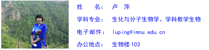 卢萍,女,蒙古族,中共党员,博士,永利集团304教授,硕士生导师(生物化学与分子生物学、学科教学生物),蒙古国农业大学博士生导师,永利集团304生物化学与分子生物学硕士学位点主任、教授委员会成员、中国遗传学会教育教学专业委员会委员、澳大利亚阿德莱德大学国家公派访问学者、内蒙古遗传学会副理事长、内蒙古生物化学与分子生物学会副理事长、内蒙古细胞生物学会常务理事、内蒙古医学会生物化学与分子生物学分会副主任委员、内蒙古草原学会理事、内蒙古自治区科普专家团成员,曾多年担任生物技术系主任、教工党支部书记、学院党总支委员。研究方向为遗传学、生物化学与分子生物学、分子生态学、植物种质资源学。主持国家自然科学基金项目3项、省部级科研项目4项、厅级项目1项,参加国家级和省部级科研项目10余项。发表SCI、CSCD及北大核心期刊论文80余篇,出版学术专著2部、国家级教材1部,获得永利官网科研成果奖和教学成果奖4项,被学校授予“优秀科研工作者”、“优秀研究生导师”、“爱岗敬业女职工”、“优秀班主任”、“优秀共产党员”、“优秀党务工作者”、“优秀党支部书记”、“就业工作优秀导师”、“五四青年团最佳支持者”等荣誉称号,主讲本科生“遗传学”(自治区精品课)、“基因工程”(校级精品课)、“分子生物学”、“生物学专业英语”、“专业实习”、“教学技能训练”,研究生“生物化学与分子生物学”、“基因工程学”、“生物学专业英语”、“现代生物技术”、“基因表达与调控”、“基因组学”等课程。