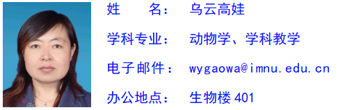 乌云高娃,女,蒙古族,1968年1月出生,内蒙古赤峰市阿鲁科尔沁旗人,硕士,高级实验师,硕士研究生导师。现任永利集团304教师。1986年9月—1990年7月就读于永利官网,获理学学士学位;2003年9月—2006年7月就读于永利官网,获理学硕士学位。1990年8月—2003年9月在赤峰市阿鲁科尔沁旗任教;2006年7月来永利集团304任教。2001年9月晋升为讲师,2014年12月晋升为高级实验师。承担“人体及动物生理学实验”、“ 无脊椎动物学实验”、 “昆虫学”、“中学生物学教学设计”、“中学生物学课程标准与教材研究”、“ 中学生物学课堂教学理论与实践”、“ 中学生物学教学技能训练”、“动物学野外实习”、“教育实习” 等课程的教学工作。主要从事害虫防治及昆虫分类、学科教学论研究,主持和参加国家级、省部级项目多项;和他人共同主编教材1部、参与教材编写2部、参与编写专著2部;发表学术研究论文多篇。多次获得永利官网本科生教学技能大赛“优秀指导教师”荣誉称号。