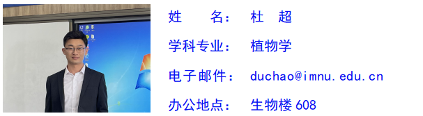 杜超,男,汉族,群众,博士,讲师,硕士研究生导师,生物技术系副主任,主要研究方向为植物逆境生理及分子生物学。主持内蒙古自然科学基金项目2项,内蒙古自治区直属高校基本科研业务费项目1项;参与国家自然科学基金项目3项,内蒙古自然科学基金项目2项。发表学术论文13篇、专利1项,获永利官网青年教师教学技能大赛一等奖、内蒙古自治区高等院校青年教师教学技能比赛一等奖。承担普通生物学、种子植物分类学、植物学实验、植物学实习、生物分类学实习、植物生物学、科学伦理、学术诚信和学术规范等本科生及研究生课程。
