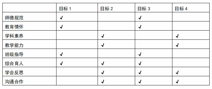 目标1:热爱祖国,拥护中国共产党的领导,践行社会主义核心价值观;热爱教育事业,贯彻党的教育方针,始终坚持立德树人;遵守教师职业道德规范,具有依法执教意识,有强烈的社会责任感和事业心,尊重学生人格,关爱学生,成为学生锤炼品格、学习知识、创新思维和奉献祖国的引路人。