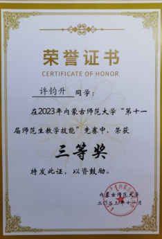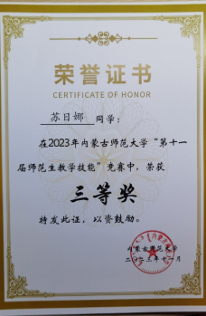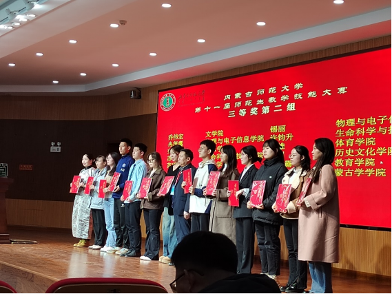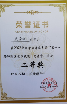 永利官网“第十一届师范生教学技能”竞赛于2023年11月4—5日在盛乐校区隆重举行,在本次比赛中,我院经过层层选拔,选派2020级生物科学汉2班的裴琦钰、许钧升和2021级生物科学蒙班的苏日娜共三名同学参加了本次技能大赛,指导教师为李景环、牛艳芳、高峰和乌云高娃。经过赛前师生的精心准备和赛场上的激烈角逐,最终裴琦钰同学获得二等奖,许钧升和苏日娜同学获得三等奖。 奖获者荣誉证书 二等奖获得者合影 三等奖获得者合影